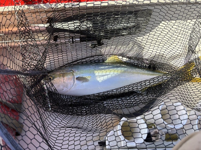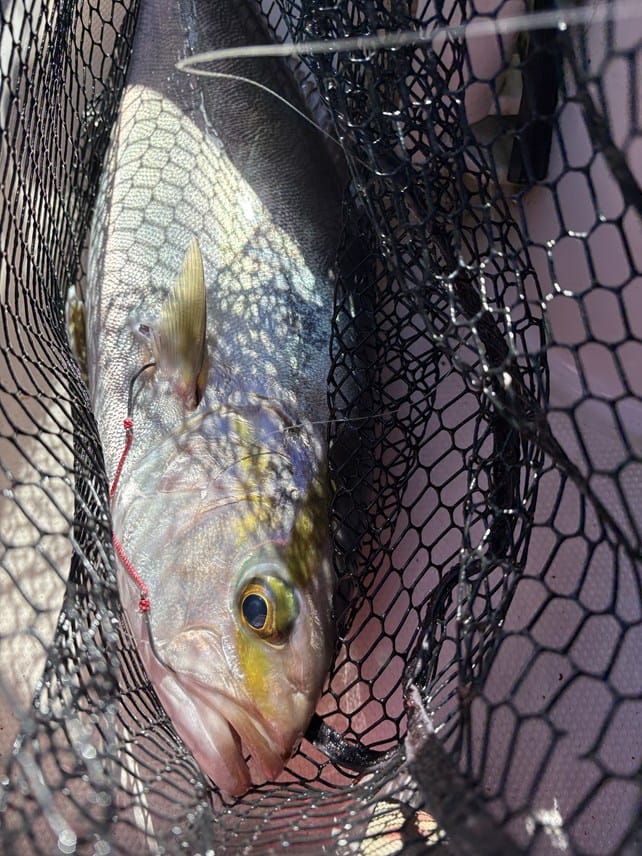 それではと、ジグを投入すると、良いアタリ。ちょっと苦戦してタモ入れ。良型のヤズ。