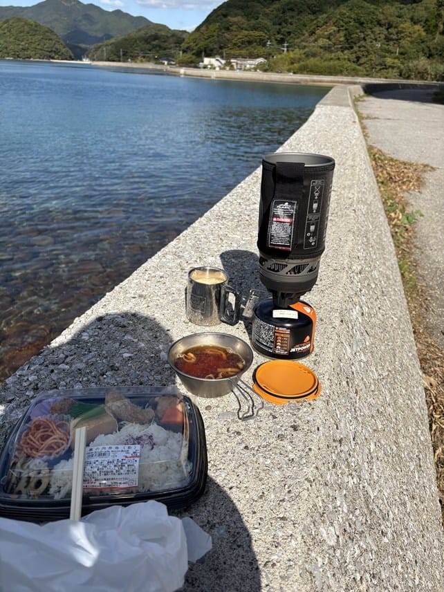 昼前に到着し、ヒライで買った弁当とインスタント味噌汁、インスタントラテで昼食を楽しむ。寒くもなく天気も良いのできもちよい。こんな時間をもてるのは幸せだと思う。
