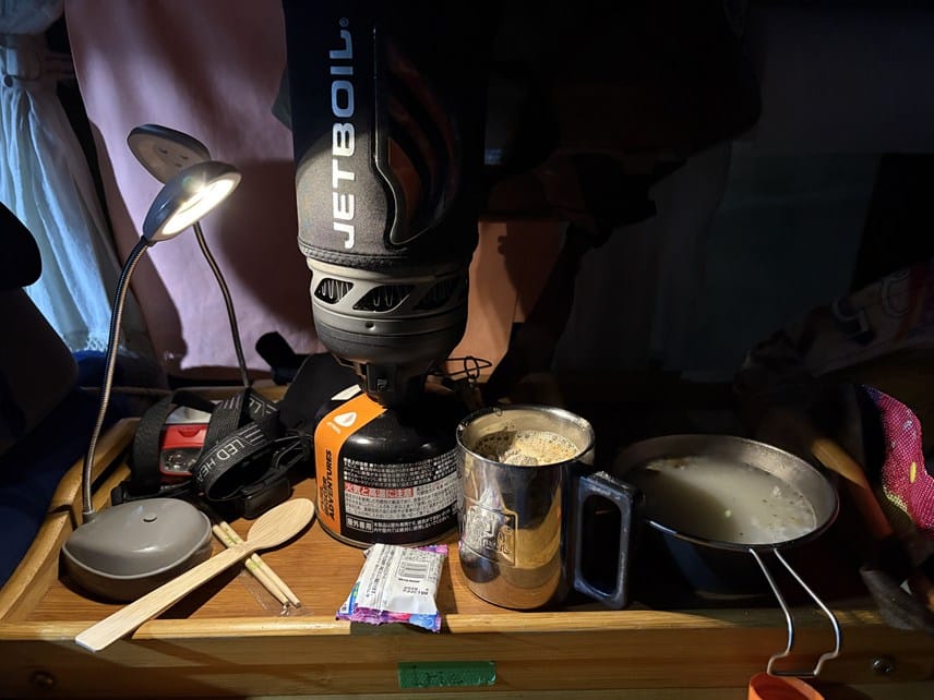 いつもの軽い朝食をすませる。手軽にお湯が素早く沸かせるジェットボイルは便利だ。