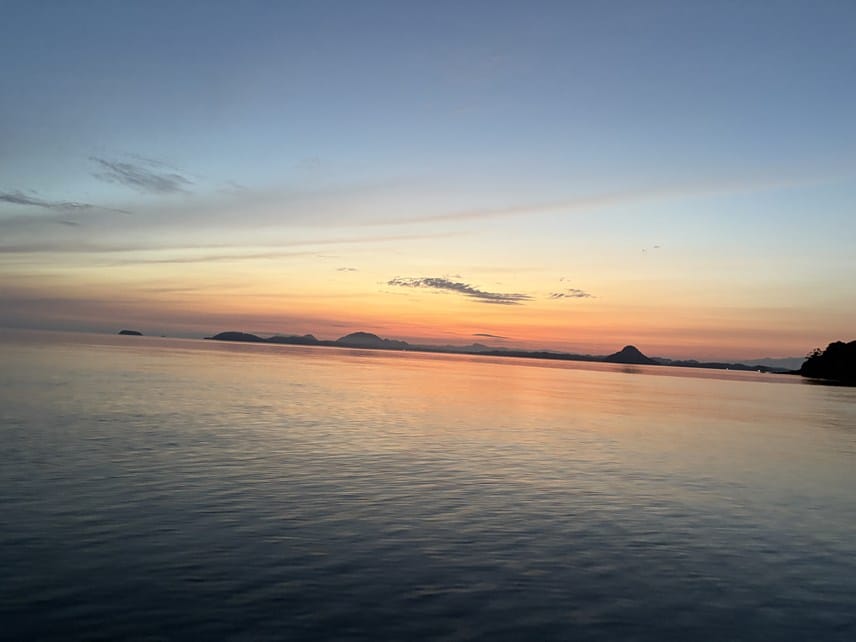 夜明け前に航海灯をつけて出航。べた凪の気持ち良い朝の海はすがすがしい。