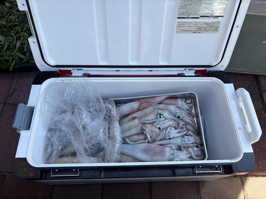 スミをフォーセップで抜いて餃子アルミパッドにならべてクーラーに入れるので状態も良い。水温が高いのか個人生け簀にイカを入れておいてもすぐに弱ってしまう。なので、マメにイカをしめてスミを抜きバットに並べてクーラーで冷やしたので状態は良い。