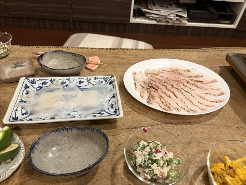 夕食はイカ刺と先週釣ったアコウのしゃぶしゃぶ。イカ耳の刺身がコリコリして美味しい。